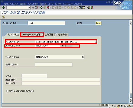 「デバイスタイプ」 、「スプールサーバ」 をセットし、[HostSpoolAcc方法]タブをクリックします。
