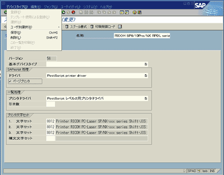 「変更」ボタン(もしくはF8キー)を押しドライバ・プリンタ文字セットなどを編集します。