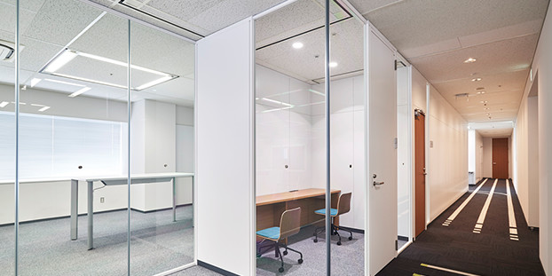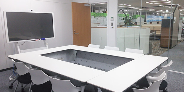 ガラス間仕切りで中の様子がわかり、利用状況や時間を意識することができる会議室