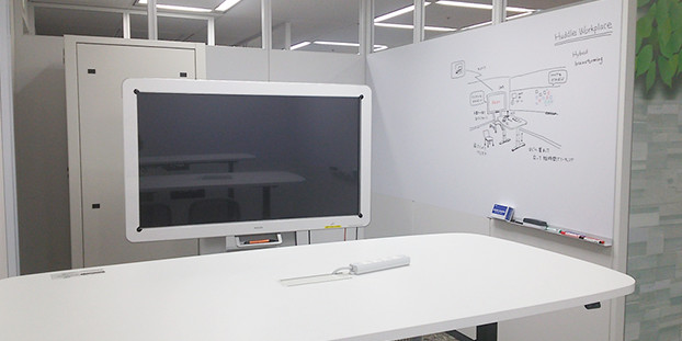 すぐに集まってデジタルとアナログのホワイトボードに書きこめるハドルのミーティングスペース