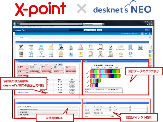 desknet's連携アダプタは、ネオジャパン社製グループウェア「desknet's NEO」のトップ画面にX-pointの承認ステータスやフォームライブラリをガジェットとして表示可能です。