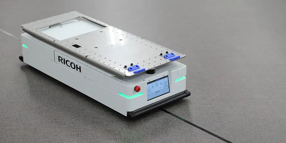 リコーのAGVは、床⾯のテープを認識、⾃動で⾛⾏し荷物を運搬する仕組みです(位置精度が⾼精度なガイド⽅式を採⽤)。