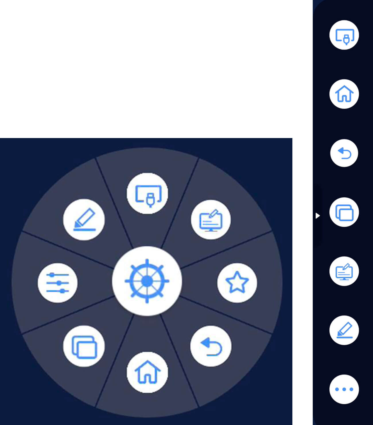 画面の左右をタップすると、すぐにサイドツールバーメニューを表示できます。また、画面上を2本指で約3秒間長押しすると、円形のフローティングバーメニューが手元へ移動します。画面のどこにいても手軽にツールを使うことができます。