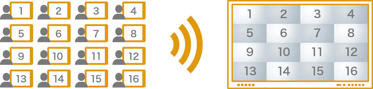 Google Cast®、Miracast®、AirPlay、WebCastに対応し、専用アプリ不要で表示することが可能です。着席したまま、端末画面をRICOH IWBに無線で投影でき、最大16分割で表示することができます。