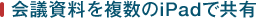 会議やプレゼンテーションの際、資料を複数台のiPadで共有できます。また、発表者がiPad 上でページをめくると、会議参加者のiPadでも自動でページがめられるので、効果的な説明やプレゼンテーションが可能です。