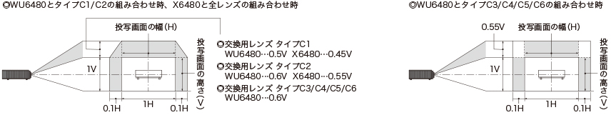 | 投写距離比*1 | WU6480 | 0.381 | 0.76-0.95:1 | 1.14-1.71:1 | 1.61-2.42:1 | 2.37-3.6:1 | 3.53-5.65:1 | 5.52-8.83:1 | - |