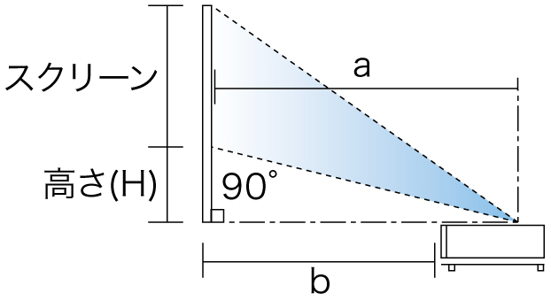 | 画面サイズ | 投写距離(a)mm | 投写距離(b)mm | 高さ(H)mm | |||