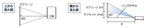 下図と下表や計算式を参考にして画面サイズと投写距離を決めてください。