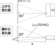 右図と下表や計算式を参考にして画面サイズと投写距離を決めてください。