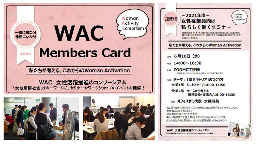 主に「女性活躍社会」をキーワードに、セミナーやワークショップなどのイベントを開催しており、活動を通じて、誰もがイキイキと働き続けられる職場環境づくりや新たな製品へのアイデア出し、サービスづくりを目指します。