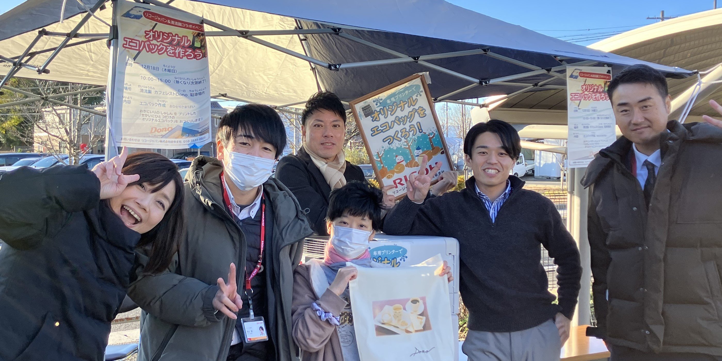 布用プリンターを使用して写真などを印刷したエコバッグを作成するイベントで、清流園の利用者の方々にもご協力いただき一緒に作成。印刷からお渡しまで一つひとつ丁寧に作業、完成したエコバッグを受け取った方からは喜びの声が上がり、笑顔の溢れるイベントとなりました。