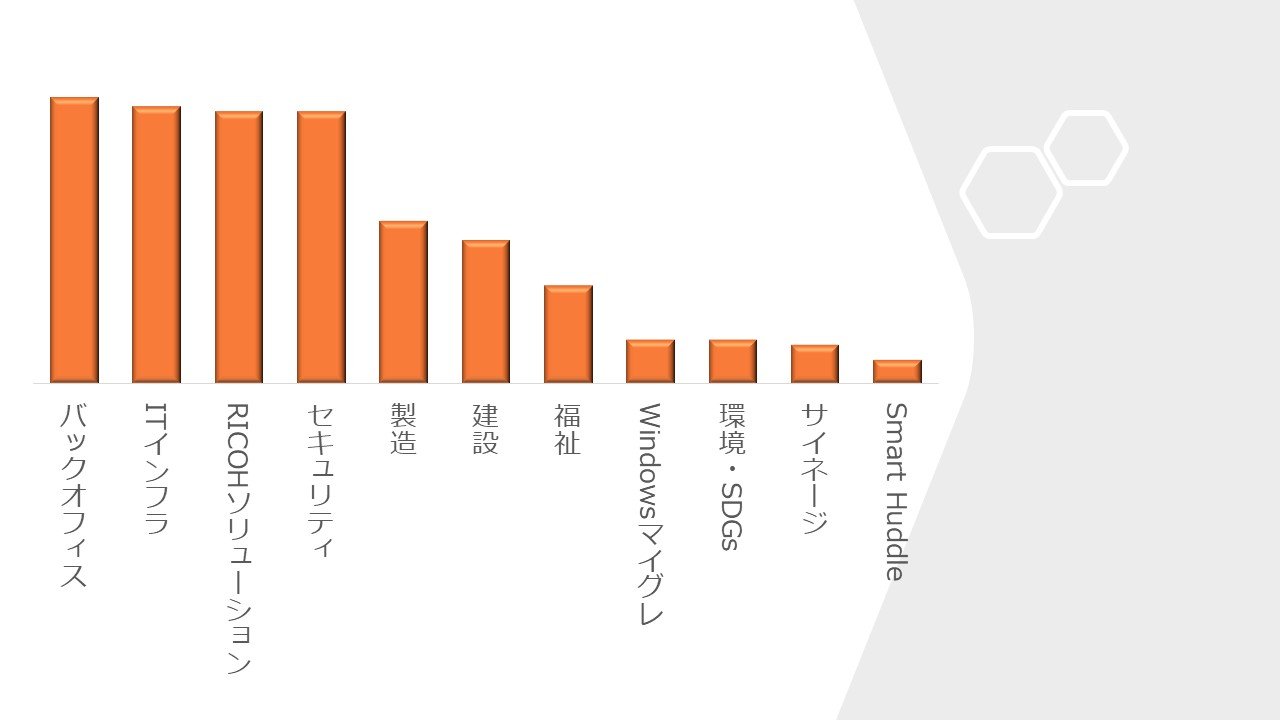 また、注目度の高かったゾーンとしては、特にバックオフィスソリューション(企業の基幹業務の効率化)が挙げられ、次いでITインフラ、セキュリティ、RICOHソリューションに関心をお寄せいただきました。これらはお客様の課題意識が高い領域であり、今後も継続的に情報提供を行ってまいります。