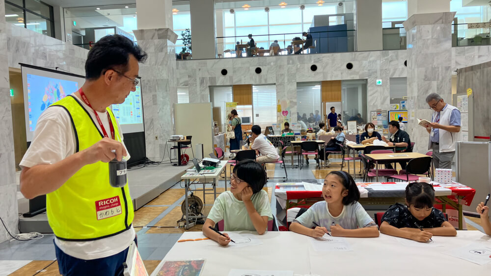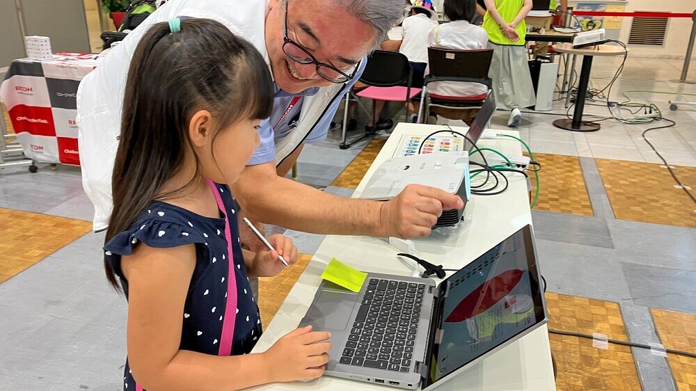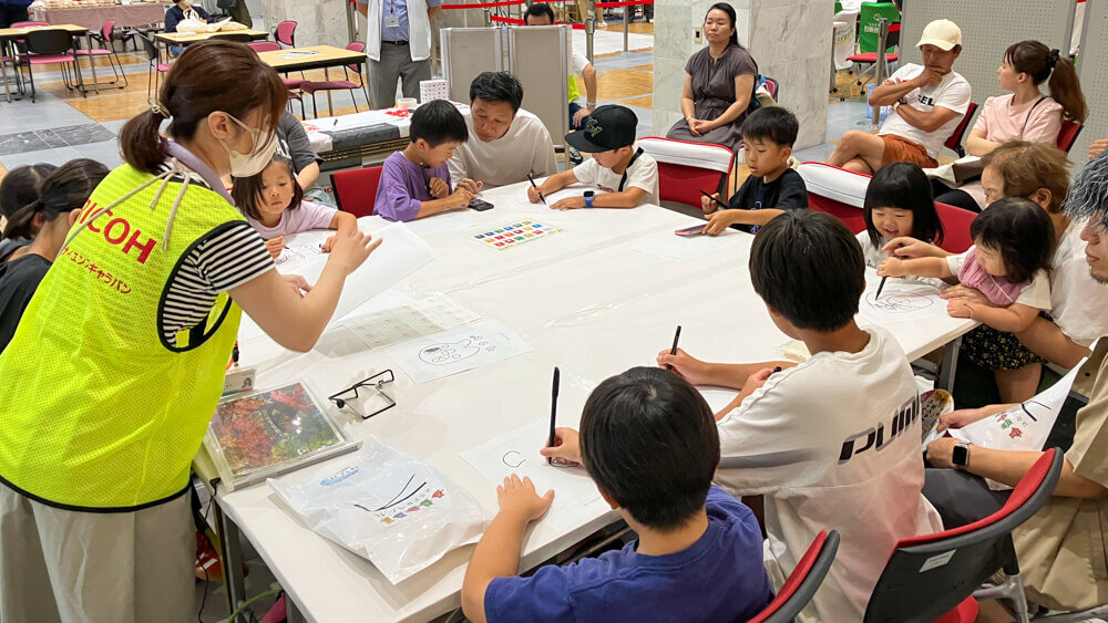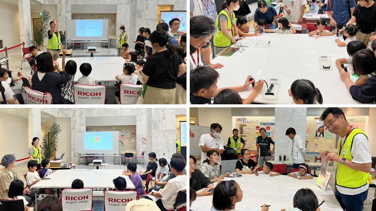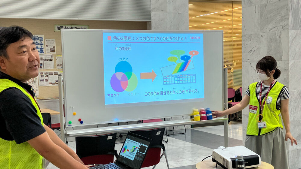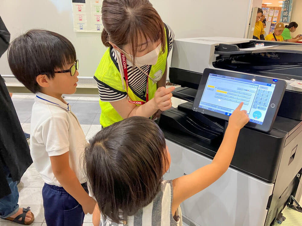今回、兵庫支社は夏休みの自由研究としても学べる科学体験プログラムの、リコー・サイエンスキャラバンライト「コピー機のひみつをさぐれ!~光と色の三原色~」・「オリジナルシールづくり」と、イベント・店舗向け販促支援サービスの「RICOHデジタルメッセージボード~SDGsツリー版~」を出展しました。