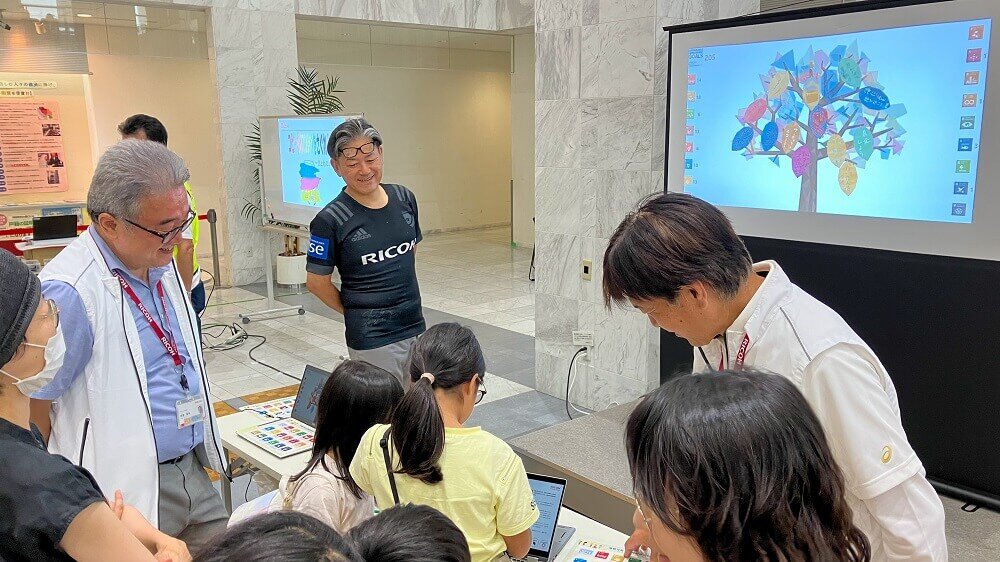 RICOHデジタルメッセージボードでは、SDGsに関するみんなの想いを集めて、シンボルツリーを作る体験をおこないました。