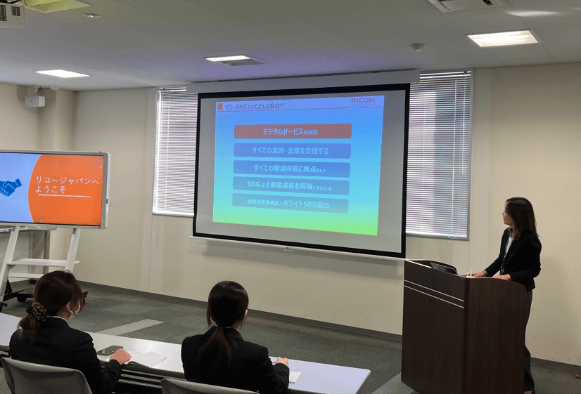 続いて、会社概要の説明を行い、リコー製品の紹介や「ViCreA」(オフィス見学ツアー)を実施し、実際に働く環境を体感していただきました。