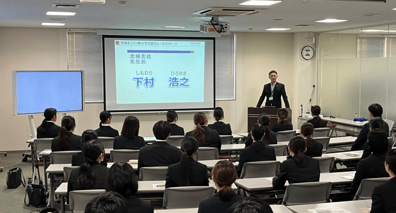 2025年10月23日(木)、茨城キリスト教大学の学生31名と引率職員2名の皆さまが、キャリア支援センター主催「業界研究バスツアー」の一環として、茨城支社へ来社されました。