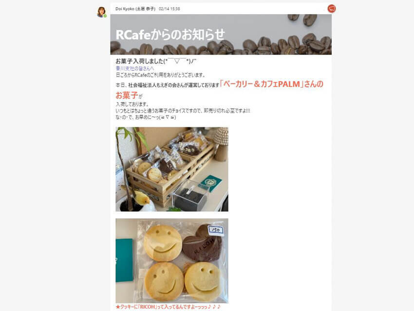 また、イベント時には来場記念品としてRICOHロゴが刻印されたクッキーを作っていただきお配りするなど、社外の方にも味わってもらえるようにしています。