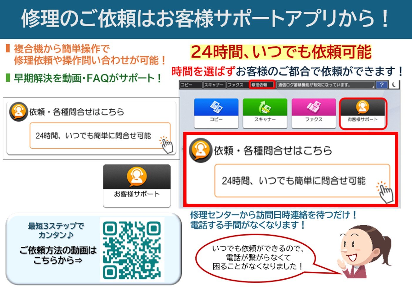 対応機種をご利用のお客様は、複合機マルチパネル上のお客様サポートアプリからも修理依頼・お問い合わせが可能です。