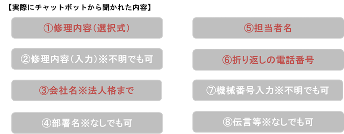 チャットボットでは、以下の情報があれば修理依頼が可能です。