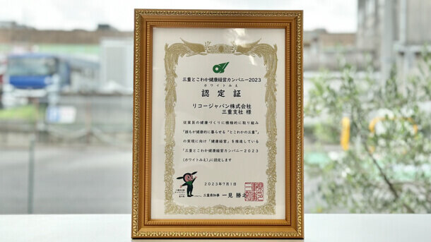 リコージャパン三重支社では、ICTを活用したオンライン健康活動の実践をおこなっており、健康増進による労働生産性の向上活動を通じた風土醸成、ワークエンゲージメントアップの取り組みから認定されています。