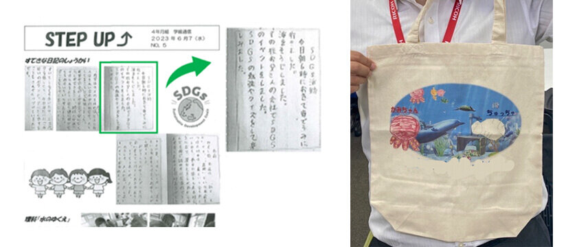 (写真左)学級通信で日記が紹介されました/(写真右)自分で描いた絵がエコバックに