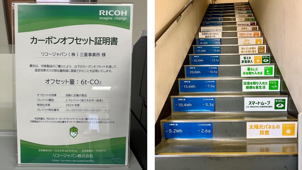 自社事業としての取り組みは、三重県SDGs推進パートナー登録時の取り組み以外にも、リコージャパン全国だけでなく、三重県の事業活動として三重支社のサステナビリティ目標を立てて取り組んでいます。
