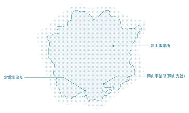 山陽道の中央に位置し、中国地方の経済・交通の重要な役割を担う岡山県。県内3拠点(岡山・倉敷・津山)で県下全域をカバーしています。社員の9割以上が岡山県出身です。地元岡山に貢献できるよう全社員一丸となって取り組んでまいります。