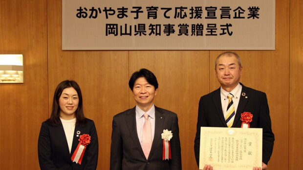 令和3年3月、仕事と育児が両立できる環境の整備や地域における子育て支援などに積極的に取り組んでいる「おかやま子育て応援宣言企業」のうち、優れた成果を上げた企業に贈呈される県知事賞をいただくことができました。