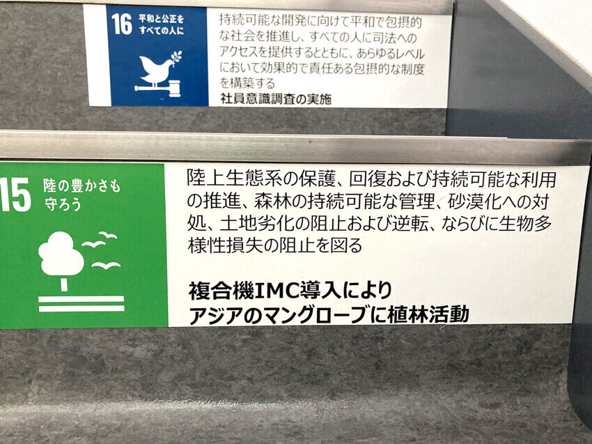 リコージャパン岡山支社の階段にはSDGsに対する自社の取り組みをシールで貼り付けています。また階段の踊り場の壁には、社員一人ひとりのSDGs宣言を投影しています!