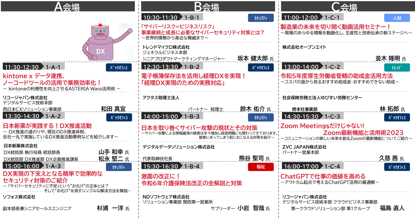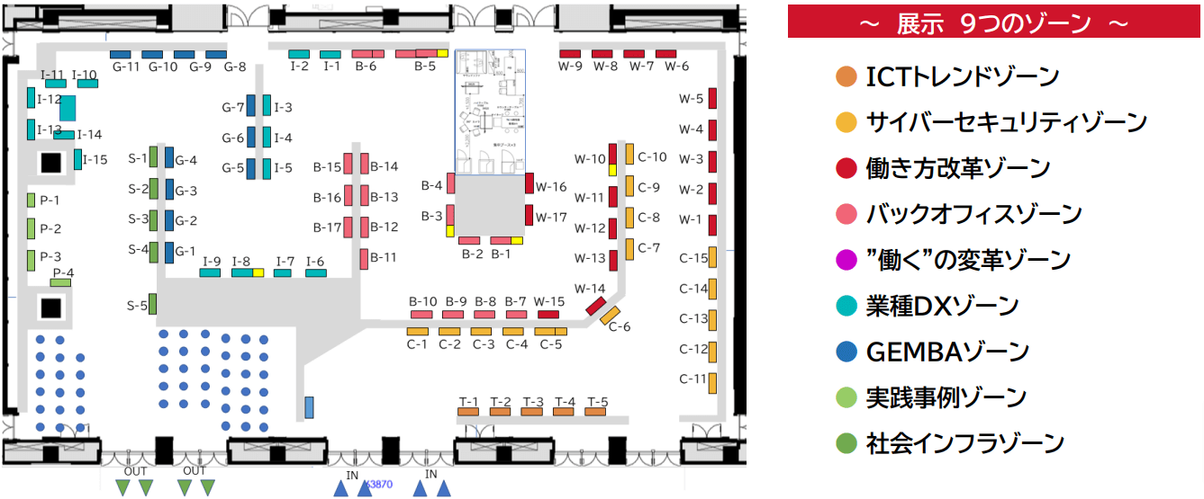 「DX」にふさわしい、AIやRPAのゾーン、社内を守るサイバーセキュリティ対策のゾーン、オフィス環境を支える基幹業務や実際の什器各業種に合わせたソリューション、弊社実践事例など各種取り揃えております。