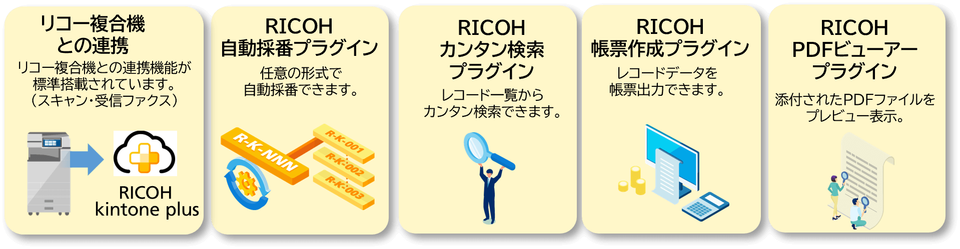 kintoneの基本機能はそのままに、リコーだからこそ提供できる「あったらいいな」という便利な機能を標準で搭載しています。
