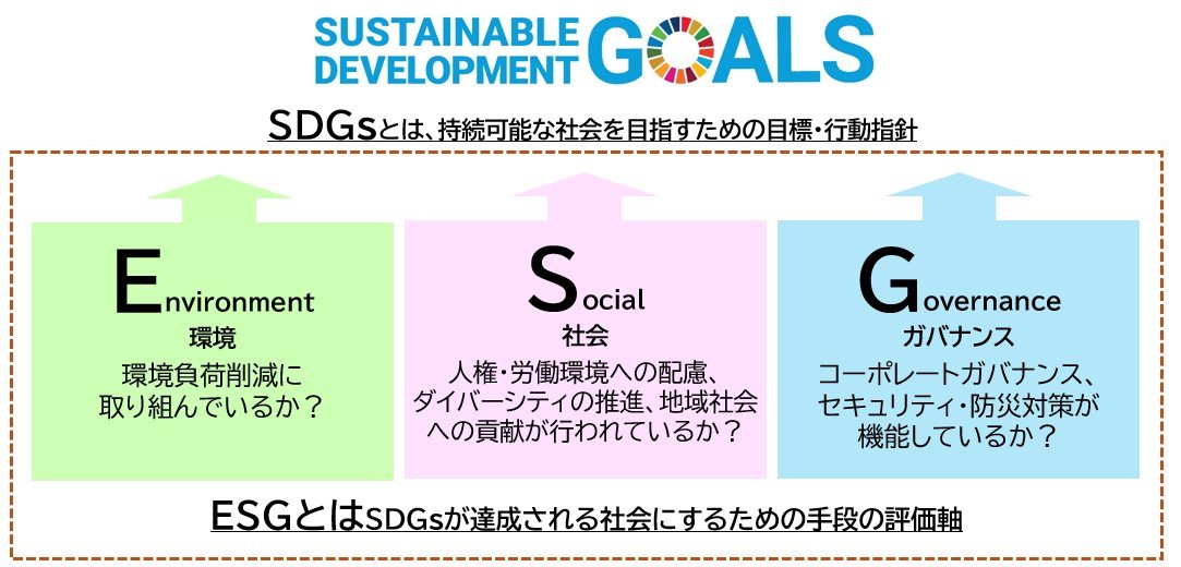 ではESGとは、SDGsの目標達成のために企業が取り組む手段を
