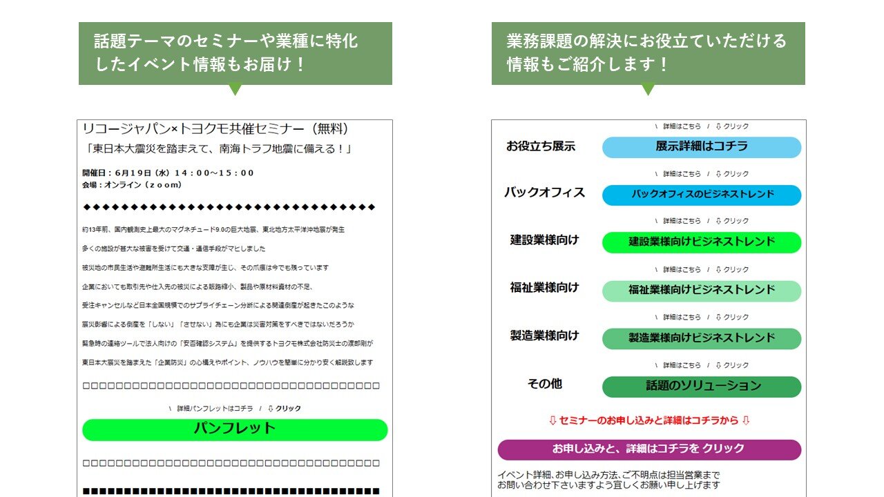 事例紹介などのお役立ち情報や記事の新着情報などをいち早くメールでお届けします。