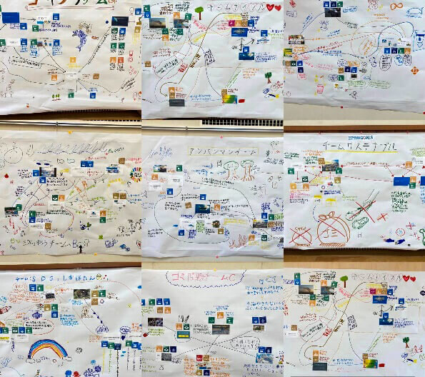 子どもたちはみんなで話し合いながら、図を作成する過程で全てがつながっていることに気づき、大きな相関図を10枚も作成しました。