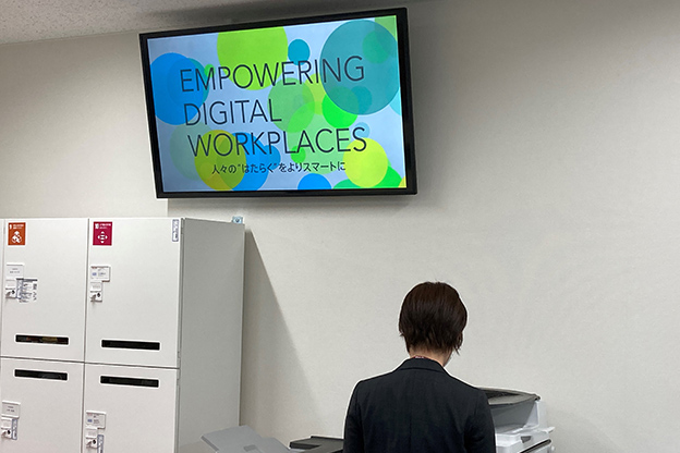 会議室の壁面を自分たちでDIY(リコー製 ラテックス大判プリンターで壁紙を制作)しました。Teamsのオンライン会議では、背景画像をセットしなくても美しい桜島の会議室は、社員はもちろんお客様にもご好評いただいています。