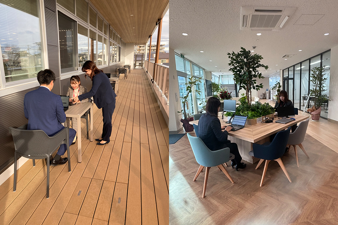 自然の光、風を感じながら「集中とリフレッシュ」を同時に得られるバルコニーエリア。テーブル中心部のシンボルツリーとたくさんのグリーンがあることでいつも緑に囲まれ、社員の充実感にも繋がっています。
