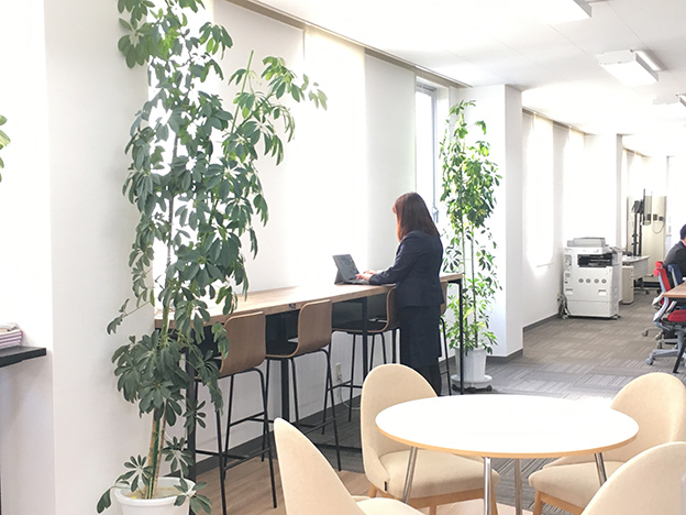 例えば、窓側カウンター席では立ちながら仕事ができる環境を構築しました。