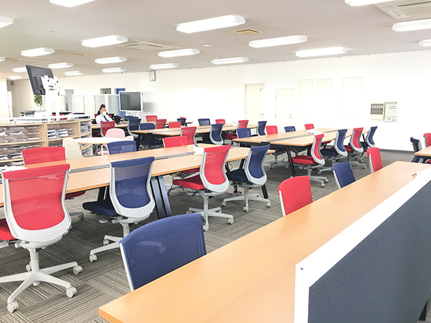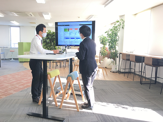 時間短縮で打合せ可能なオープンスペースを設置。リコーインタラクティブホワイトボード(電子黒板)やWeb会議システム(Microsoft Teams)を活用し、離れた拠点とも効率的な会議を実現しています。
