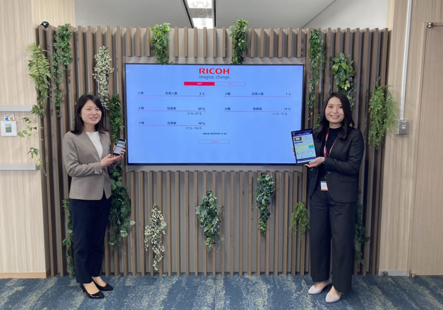 より円滑なコミュニケーションが図れるよう、オフィス内では座席管理システムを導入し、誰がどこで働いているのか、見える化しています。また社内のお知らせはデジタルサイネージを活用し、全事業所への情報伝達の水平化を図っています。