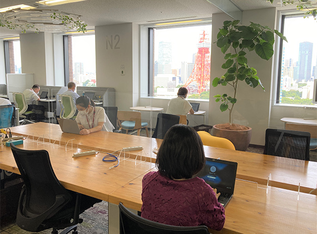 予約フリーで気軽に打ち合わせができるスペースや落ち着いた雰囲気の中でソロワーク可能な「芝ラウンジ」など、働くシーンに合わせて仕事の環境を選択でき、ひらめきやアイデアがフクラムような働き方を実践しています。