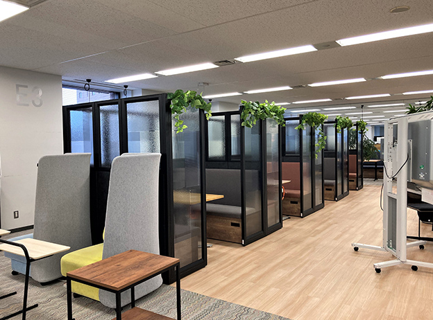 社員の要望を取り入れ、業務に集中できる「フォーカスエリア」を新設しました。さらに、チームで集まりやすい「コミュニケーションエリア」を中央に配置することで、仕事もコミュニケーションも“はかどる”オフィスを実現しています。