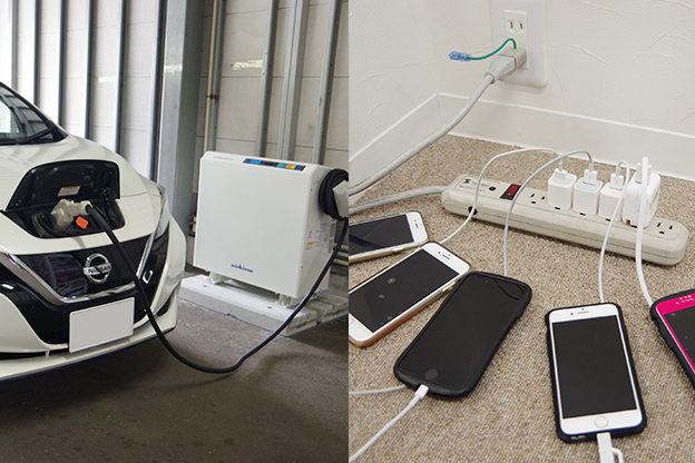 EV充電スタンドを介して、緊急時にはEV(電気自動車)を蓄電池として活用します。EV(電気自動車)に蓄電された電力は、社屋のBCP対策コンセントから、テレビやスマートフォンなどの電力供給源として、BCPにも活用しています。