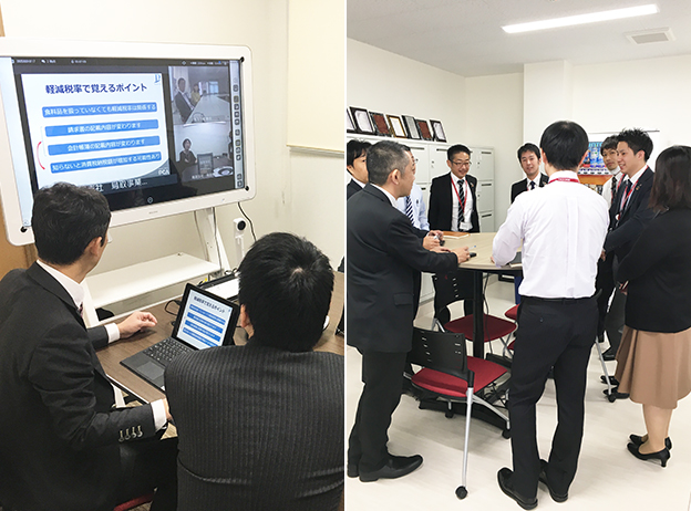 会議室以外の多様な打ち合わせスペース設置しています。短時間の打ち合わせは、円卓で顔を見ながら。遠隔での個人同士の会議は、モバイルパソコンやスマートフォンで Microsoft 365を活用して参加します。