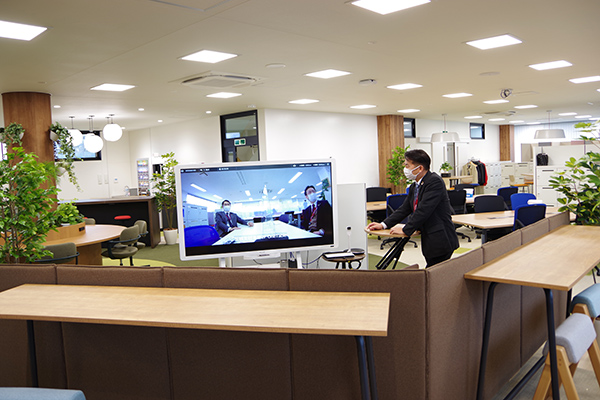 テレビ会議システムを常時接続したオープンでカジュアルな空間が活躍しています。離れた拠点の社員とも、気軽にすぐに打ち合わせができ、飛び入り参加もし易い雰囲気づくりで、コミュニケーションを活性化させています。