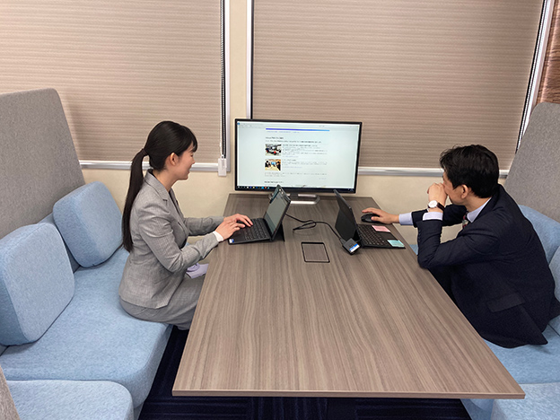 座ると包まれるような安心感を感じられるハイバックソファを導入したリラックス空間で打ち合わせを行っています。雑談も交えながらの交流は新しいアイデアが生まれることもあり、コミュニケーションが活性化する空間となっています。