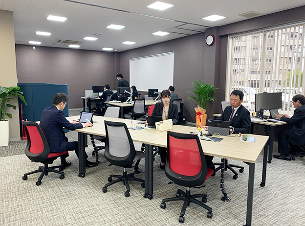 働く場所と机を選択するABW*を取り入れ、集中ブースや二画面モニターの活用で生産性向上を図っています。また、直行直帰や在宅勤務などを取り入れることでワークライフバランスの実現を目指しています。
