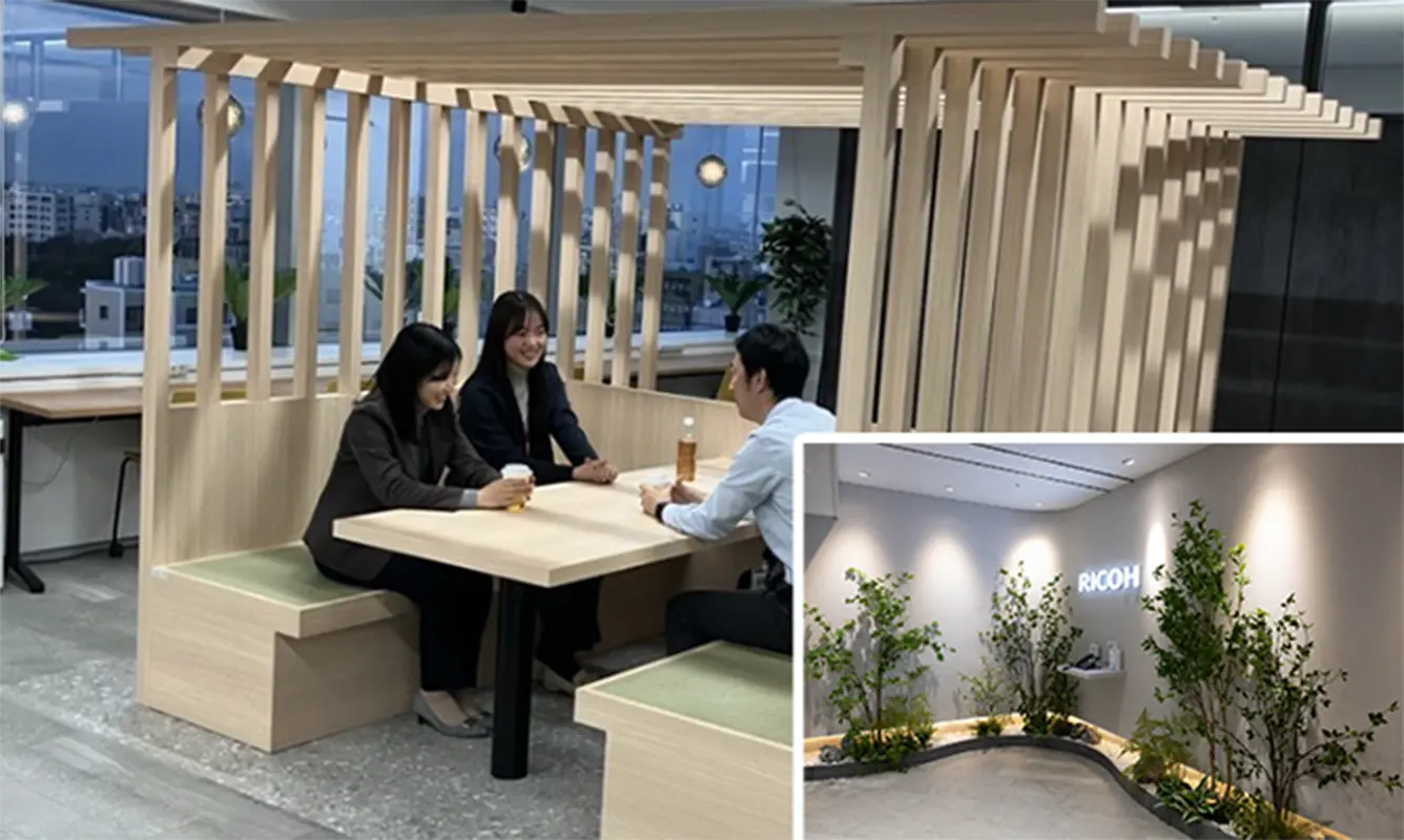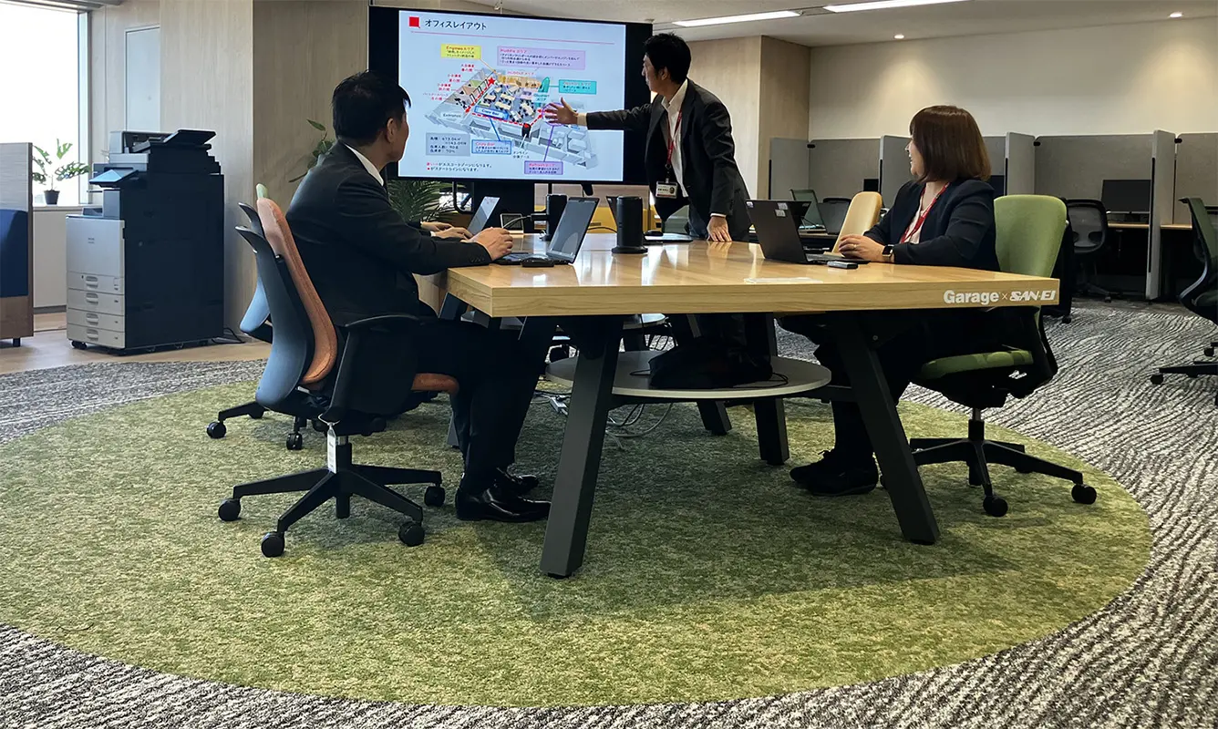 庭園の池に浮かぶ小さな島を、オフィス空間に取り入れることにより、落ち着いた雰囲気の中で快適に仕事を行う場として活用しています。併せて、大型モニターがあることで、打合せや意見交換の場としても活用しています。