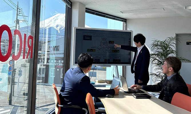 会議や勉強会もITを活用し、ペーパーレスで実施しています。無駄な紙を削減するとともに効率的な議事進行ができるなど生産性の向上にも繋がっています。
