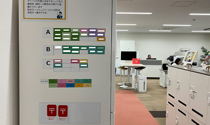 袖机のないフリーアドレスの執務室です。個人宛に届いた郵便物などは、ポストのついた個人キャビネットに投函しています。ポスト投函する社員の負担軽減や、空いているキャビネットがすぐに見つかるように地図を作るなど工夫をしています。