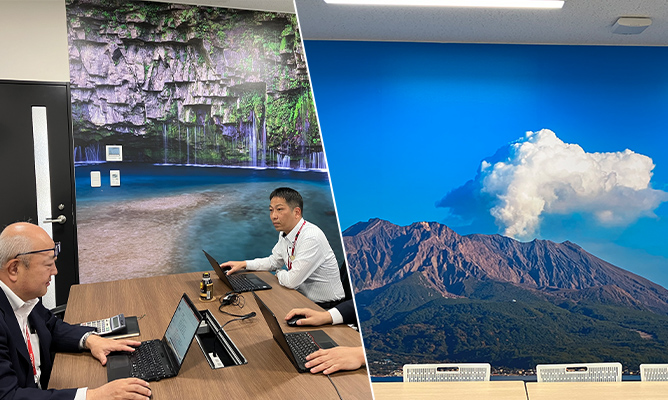 会議室の壁面を自分たちでDIY(リコー製 ラテックス大判プリンターで壁紙を制作)しました。Teamsのオンライン会議では、背景画像をセットしなくても美しい桜島の会議室は、社員はもちろんお客様にもご好評いただいています。